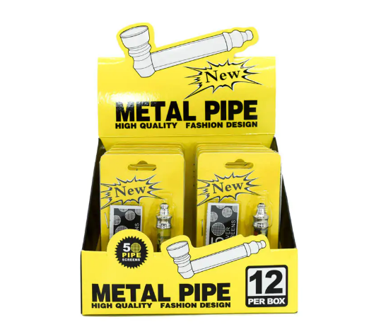 Pipa de metal con rejillas DK en blister Dimensiones : 3.50cm alto x 2.00cm ancho x 12.00cm largo Peso : 10 grs
